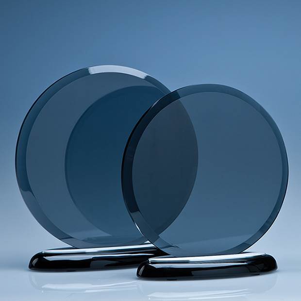 This exquisite 17cm Circle award perfectly combines 3 different materials of smoked glass that is bonded into a brushed aluminium section and mounted onto the black piano finish wood base. The glass circle has a large engraving area that can be personalised with any crest, logo or wording to create an award that is sure to take pride of place when put on display at home or at work.