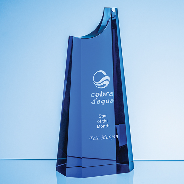 The 24cm Summit Award is a masterpiece of distinction and achievement which has been hand crafted from the finest quality cobalt blue optical crystal. The award commands attention with its presence, vibrant colour and sense of occasion. There is a generous engraving area that can be personalised with any crest, logo or wording to create an award that is sure to be treasured by the recipient. The award is supplied in a foam lined gift box.