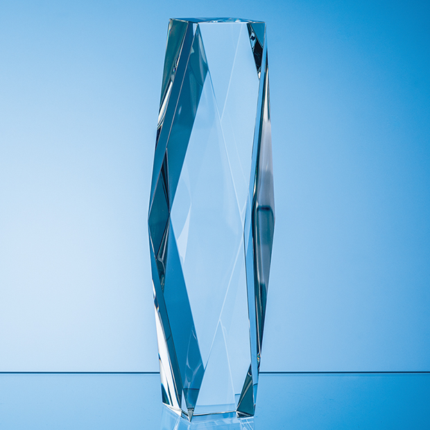 The 25.5cm Optical Crystal Genesis Column Award stands proud as a beacon of style and elegance. It benefits from a generous area for decoration, allowing for personalised inscriptions, names, dates, or logos to be expertly engraved or printed onto the award. The award is supplied in a foam lined gift box.