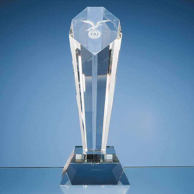 The Sloped Facet award is hand crafted out of perfectly clear optical crystal. The sloped face on the top of the column can be personalised with any crest, logo or wording to create an award that is sure to take pride of place when put on display at home or at work. It is an ideal recognition, achievement or incentive gift and is supplied in a black foam lined presentation box.