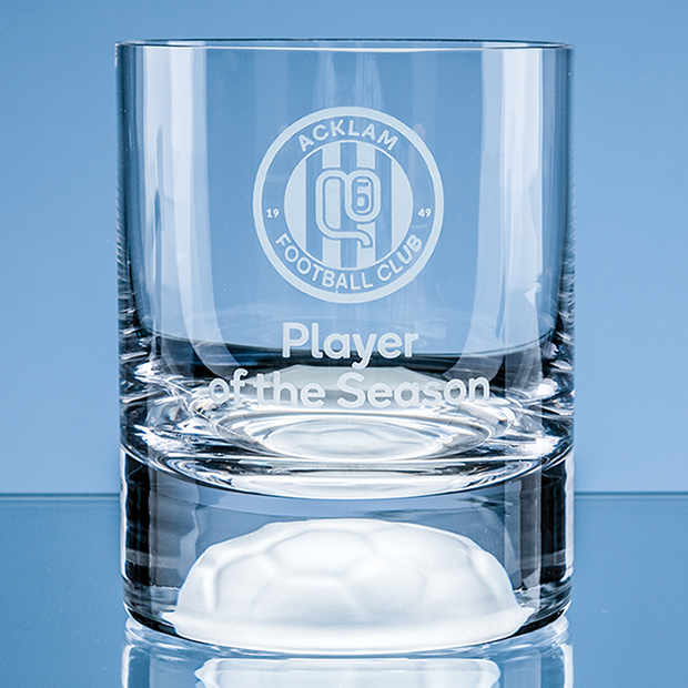 The perfect football token this beautiful 10oz Whisky Tumbler is hand blown with a half Football design moulded into the tumbler base. Well suited for a Football occassion or a a gift the glass has a large engraving area that can be personalised with any club crest logo or wording to make an ideal football related gift that is sure to be well received. Sold as an individual or as a pair why not add a luxurious Satin Lined Presentation Box to make this glass extra special.