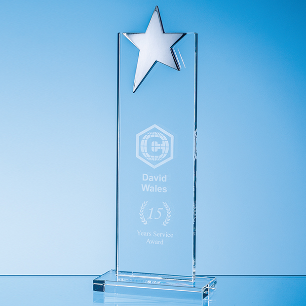 The 25.5cm Optical Crystal Mounted Rectangle with Silver Star is the embodiment of recognition and achievement, meticulously crafted to celebrate excellence with a touch of stardom. The award stands as a symbol of distinction, seamlessly merging optical crystal with a shining silver star to create a stunning masterpiece. With a commanding height the Mounted Rectangle draws attention with its graceful form and captivating design. It can be personalised with any crest, logo or wording to create an award that is sure to be treasured by the recipient. The award is supplied in a foam lined gift box.