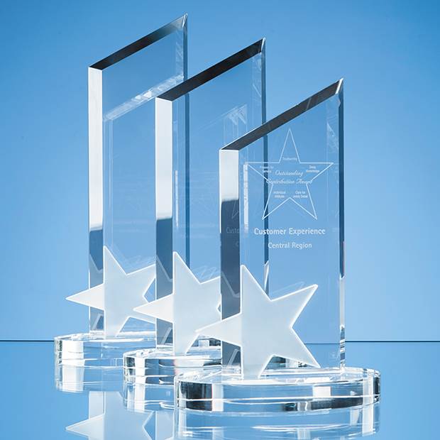 Celebrate recognition or a win with this flawless optical crystal peak award with a frosted star at the base. Available in three sizes 22cm 26cm shown and 30cm it is ideal to use as a standalone presentation recognition or award but also for 1st 2nd and 3rd place achievement whether sporting academic or corporate. With a generous area to engrave a crest company logo or message it comes in its own foam lined presentation box.