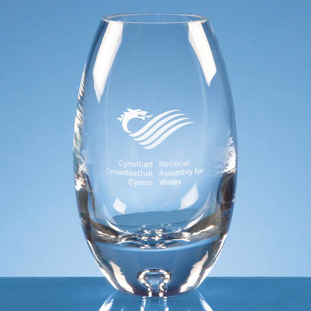 The handmade barrel vase has a bubble base and is a contemporary style. It is an ideal gift that can be personalised with any logo, crest or wording and is sure to be treasured by the recipient and displayed with pride.