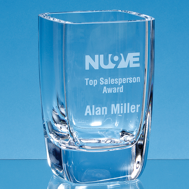 The Handmade Square Vase may be a petite 16cm in size but it is also extremely robust. It can be sandblast engraved or colour printed with any crest logo or wording to make the perfect gift for any home or workplace. The vase will come supplied in its own box but why not add a satin lined presentation box for a touch of elegance