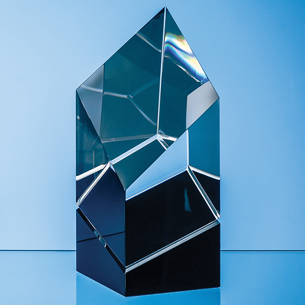 The 20.5cm Clear & Onyx Black Optical Crystal Faceted Prism Award offers an exquisite fusion of sleek sophistication and contemporary design, meticulously crafted to epitomise achievement and distinction. The clear crystal reflects the clarity and brilliance of accomplishment, while the onyx black accents add a touch of modern refinement and sophistication. It can be personalised with any crest, logo or wording to create an award that is sure to be treasured by the recipient. The award is supplied in a foam lined gift box.