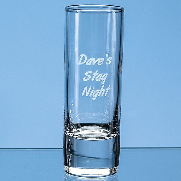 If a single single shot just doesnt hit the spot then this Tall Shot Glass is for you. At 60ml capacity this heavy base glass is certainly double trouble. Its tall unique design leaves plenty of space to add some personalisation whether it be a crest logo or some wording. Sold individually this glass would also be perfect as a set of 2 4 or 6. Why not add a luxurious satin lined presentation box to make this extra special