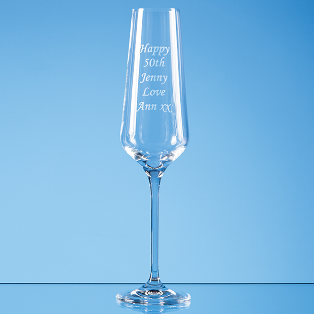 The stunning Infinity Champagne Flute brings a touch of style and elegance to any toast. Its large engraving area makes it perfect for personal messages corporate logos or club crests. The Infinity range also includes wine glasses whisky tumblers and high ball glasses.